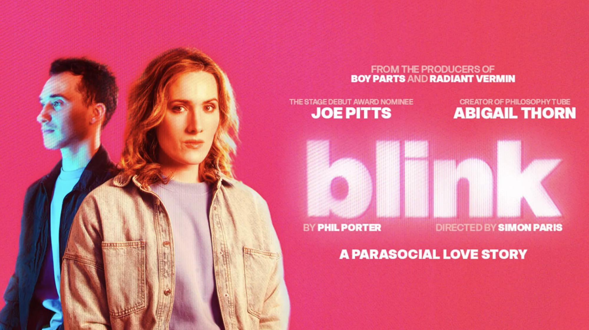 Blink is produced by Metal Rabbit Productions (Boy Parts, Radiant Vermin, Cuckoo, Soho Theatre; The Prince, Southwark Playhouse; The Misandrist, Arcola Theatre; We’re Staying Right Here, Park Theatre), and directed by Simon Paris (…Earnest?, Edinburgh Fringe & UK Tour).