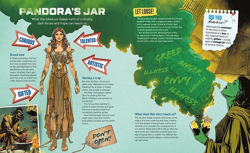 The standard format of 98 pages, a glossary (Ambrosia anyone), index and the big quiz with questions at the end of each section, is followed. Most topics have a two page spread all in bright colour with some amazing graphics, and a few colour photos (parthenon frieze, the real Mt Olympus and yes – ruins!). The 12 labours of Hercules actually take 4 pages so the format is not too rigid.